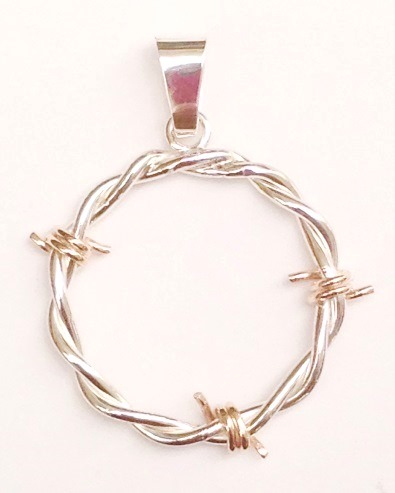 This is Michelle's take on barbed wire. Two strands of sterling silver wire twisted together accented with sterling (shown) or gold "barbs."